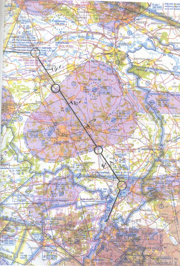eerst naar Victor, om vandaar overhead het veld op 1500 vt naar Bravo te