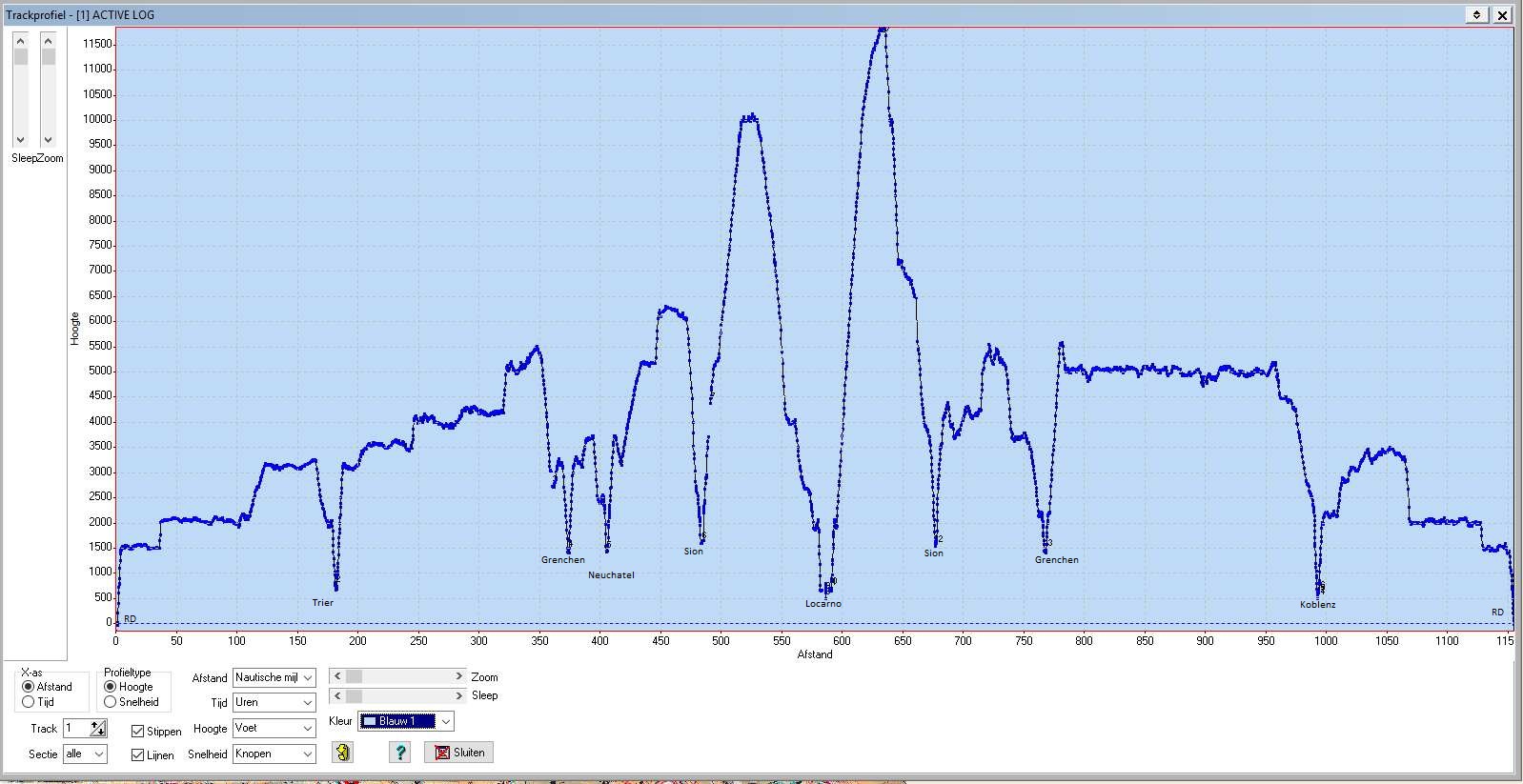 Naar Locarno over de Zwitserse Alpen. Dat leek ons dit jaar leuk om te doen. We hebben het gedaan met de Robin PH-SVT. Die heeft het tot volle tevredenheid gedaan en ons met gemak tot boven de 11.000 voet gebracht. Hoger is niet verstandig omdat het gebrek aan zuurstof parten kan gaan spelen. Wij hebben er niets van gemerkt.... maar ehh is dat niet een van de kenmerken van te weinig zuurstof ?? Overigens is het verplicht om boven de 12.000 voet zuurstof mee te nemen en te gebruiken uiteraard. Op dit plaatje kun je precies zien hoe hoog we gevlogen hebben. Onze gps heeft dit allemaal netjes geregistreerd. Dag 1, maandag 4 sept Onze reis begon zoals altijd in Rotterdam. Het plan om vandaag, maandag 4 september 2017, Neuchatel te halen leek haalbaar. We hadden graag deze reis in de wat snellere PH-XYZ gemaakt, maar die moest de werkplaats in voor een motorwissel. Dus waren we aangewezen op de PH-SVT, van buiten en van binnen even groot maar 10 pk's minder onder de kap. Maar evengoed wel een diesel, dat moet te merken zijn in de bergen. Om even over half elf hingen we in de lucht, mooi weer, weinig tot geen turbulentie, prima zo. Het vluchtplan kon afgewerkt worden, rechtstreeks naar Zundert de grens over en dan via Diest naar Luik om daar over het veld te vliegen verder naar de Ardennen. Het verliep allemaal gesmeerd. In no time waren we aangekomen in Trier. 1 uur 50 was de vliegtijd, we vonden het netjes. In Trier was zoals we wisten het restaurant gesloten, dus waren de zelfgemaakte broodjes aan de beurt. Na het tanken ging het verder naar het zuid-oosten. Ten zuiden van Kaiserslautern rechtsaf naar het Zuiden, het franse luchtruim in. Naar Hagenau en daarna de Rijn volgend langs Strassbourg en zo verder naar het zuiden. Heel wat geschakel met de diverse verkeersleiders, maar het liep gesmeerd, onderwijl klimmend naar 5000 voet om over de eerste bergjes bij Grenchen te komen. Bij het plaatsje Oensingen heb ik me bij Grenchen aangemeld, en van daar af krijg je telkens de vervolg meldpunten op. Heel gemakkelijk. Het weer is nog steeds perfect. We verbazen ons dat het zo stil is in de lucht, geen enkele turbulentie. Komt natuurlijk door de alom aanwezige hoge sluierbewolking, die schermt alles netjes af. Prettig toch. Na alweer 1 uur en 50 minuten staan we dan in Zwitserland, geen EC land, dus formulier van aankomst invullen, uiteraard op de computer. Na al deze formaliteiten, het is alweer tegen vieren, gaan we snel weer verder, we hebben nog genoeg peut in de tank voor het kleine stukje naar Neuchatel. 25 minuutjes vliegen over een prachtig landschap, de Bielersee, en het meer van Neuchatel. Schitterend !. De baan van Neuchatel ligt vanuit onze positie gezien, voorbij het stadje Neuchatel. Parallel aan het meer. We vliegen op downwind langs de baan en draaien dan naar rechts in voor final, een prachtige aanvliegroute, we genieten. Om half vijf staan we op het vliegveld van Neuchatel, een zeer klein en stil veldje. Heerlijk weer 25 / 26 graden met een beetje hoge bewolking, het voelt prima. Nu nog een hotel regelen. Ik heb dat thuis al voorbereid en ga mijn eerste adresje bellen, Hotel Alpes & Lac en meteen is het raak. We hebben een kamer voor 1 nacht, voor de preis van 194 SFR, okee dan. Met ontbijt hoor. Het hotel ligt wat hoger in het stadje, de taxi brengt ons er moeiteloos naartoe voor 50 euro. De teller gaat tikken. Het hotel heeft een prachtig terras dat uitziet over het meer, geweldig. We maken een flinke wandeling naar beneden langs het meer en weer naar boven, en trakteren ons op een heerlijke witte wijn. Dat smaakt goed zeg na zo'n dagje. Het diner nuttigen we ook in het hotel, en is zoals naderhand zal blijken het beste van de hele trip. We gaan tevreden slapen in een prima bed. Morgen wacht weer een interessante dag. Dag 2, dinsdag 5 sept. We hebben vandaag maar een relatief klein stukje te vliegen, dus rustig om half negen aan het ontbijt om wakker te worden. We gaan met de taxi, alweer voor 50 euro terug naar het veld. Voor dit eerste stukje van Neuchatel naar Sion heb ik geen vliegplan nodig, dat is makkelijk, maar ik maak van de rustige situatie gebruik om het vliegplan voor Sion naar Locarno alvast in te dienen. Ik heb een abonnement op Skybriefing.com en dat gebruik ik nu om het vliegplan aan te maken en in te dienen. Werkt voortreffelijk. Ook de complete briefing voor de vlucht komt uit de computer rollen. Het weer is wel het eerste waar ik naar kijk, en zie de passen in de bergen zijn open voor vfr. Dus geen wolken op pashoogte. Skybriefing is zeer uitgebreid, geeft aan welke gevaren er eventueel van toepassing zijn en geeft de notams, en daarbij de DABS, dat is een slimme samenvatting van de notams op kaart zodat je snel kunt zien welke notifications voor jou van toepassing zijn. We gaan ook nog even tanken, liever hier dan op een druk groot veld als Sion. Om elf uur hangen we weer, op weg naar Sion. Geneve Info verzorgt de begeleiding, het loopt gesmeerd. We vliegen over het meer en draaien dan richting Montreux. We klimmen alvast wat verder naar 5000 voet. en zien de ingang van het Rhonedal, lekker breed. Daar worden we gewaarschuwd voor opposite trafic , same altitude, en kennelijk bezig met wat traing. Ik verkies om wat hoger te gaan zitten en klim naar 6000 voet. Even daarna komen we hem tegen, een Pilatus PC10.We vliegen het dal verder in en nemen afscheid van Geneve, omdat zodadelijk het contact toch wegvalt. Na verloop van tijd maakt het dal een haakse bocht naar links, dat is bij Martigny, een meldpunt voor Sion. We blijven netjes aan de rechterkant van het dal vliegen en genieten van zoveel moois om ons heen. We komen bij Sion via meldpunt Whiskey en krijgen een lefthand circuit voor Runway 25, Dan lijkt het dal ineens toch wel krapjes... Je vliegt bijna met je vleugel door de tuintjes van de bewoners. Wel leuk. Na een ritje van 45 minuten staan we om 12 uur in het restaurant voor een snelle koffie. Dat blijkt om deze tijd ( lunch ) een moeilijke zaak, ieder